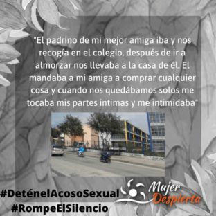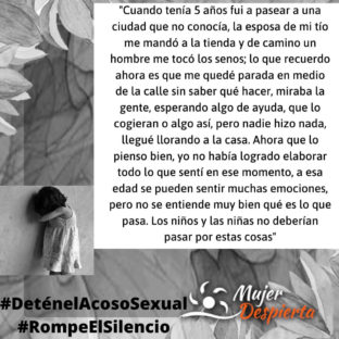 El acoso sexual es uno de los tipos de violencia contra la mujer más comunes y desafortunadamente menos penalizados. Desde muy pequeña, la mujer se ve sometida a este tipo de violencia y casi nunca se obtiene justicia, dejando a la víctima con una enorme carga emocional, (rabia, impotencia, vergüenza, frustración, culpa, etc.) emociones que puede llevar a cuestas durante muchos años, o durante toda la vida.