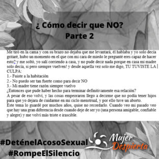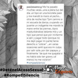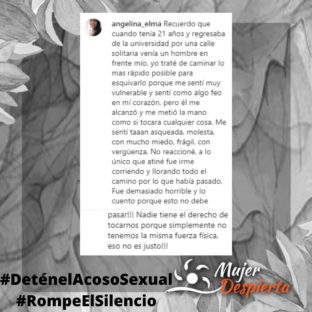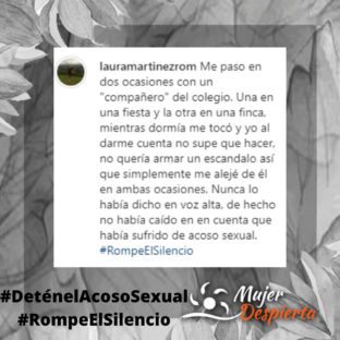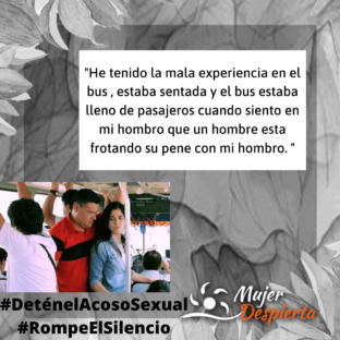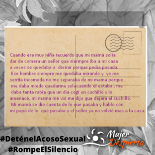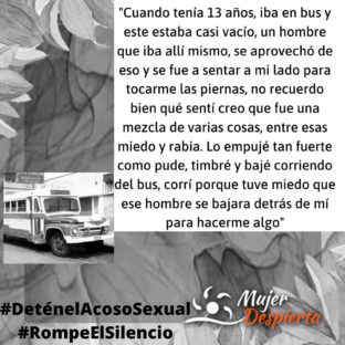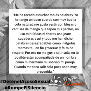 Gracias por tu coraje y tu confianza al compartir tu historia con nosotras. Con tu valentía contribuyes, no solo a generar conciencia social sobre el acoso, sino también, a que muchas otras mujeres tengan la valentía de romper el silencio y liberarse de su carga.